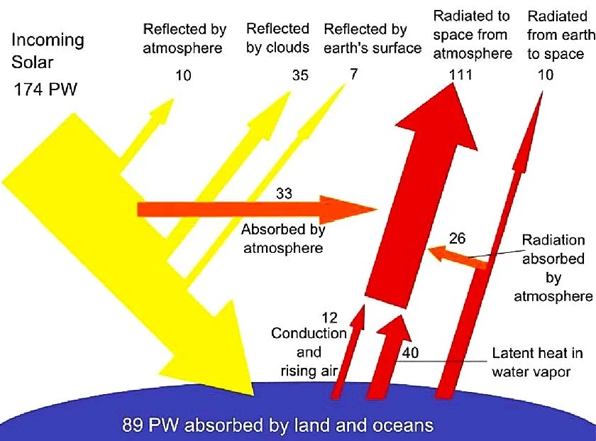Carbon dioxide and the other greenhouse gases are only half of the heating equation. They are what gets heated. How they get heated is by a process called Radiative Forcing. The short explanation is that some of the sun’s long wave energy is reflected from the earth’s surface heating carbon dioxide and the other greenhouse gases as it works its way out of the atmosphere at the speed of light. Beyond this point, the process is immensely complex and. It is interesting to note that there are three types of greenhouse gases: those that cool the air, those that heat the air and water which does both. Water vapor as cloud blocks solar energy while water vapor as humidity absorbs energy. There is between 10 and 40 times more humidity in the air than all of the other atmospheric greenhouses gases put together. More about radiative forcing is available in the Reality Check version of this article.